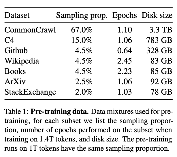 LLaMA는 공개적으로 사용 가능하고 오픈 소스와 호환되는 데이터만 사용한다는 제한을 두고 다른 LLM을 학습하는 데 활용된 데이터 셋을 재사용하였다. 사용된 데이터셋과 데이터의 비율은 아래와 같다.