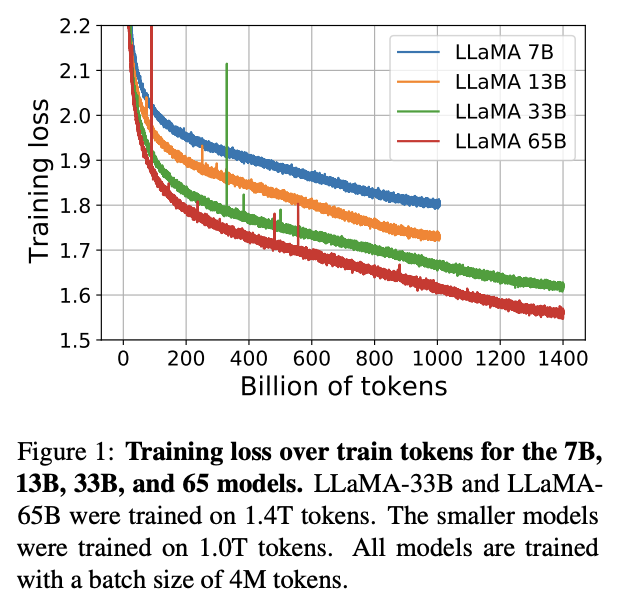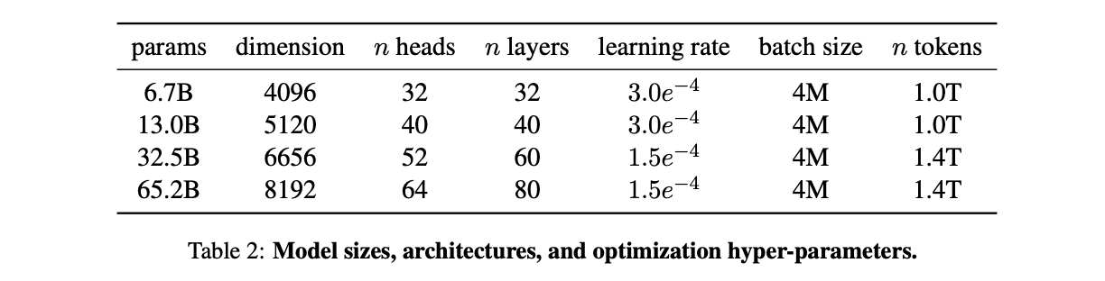GPT-3가 1.3B부터 175B까지 네 가지 모델을 제공한 것과 마찬가지로, LLaMA도 7B, 13B, 33B, 65B의 네 가지 모델을 제공한다.