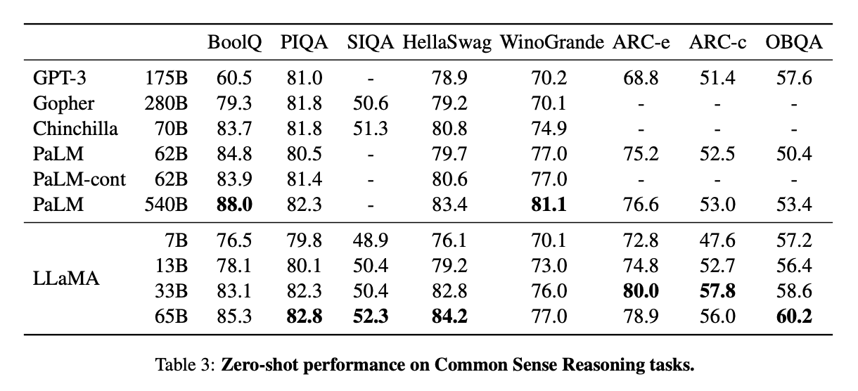 LLaMA-13B는 GPT-3의 10분의 1 크기에도 불구하고, 대부분의 벤치마크에서 GPT-3보다 높은 성능을 보였다. 한 발 더 나아가, LLaMA-65B는 Chinchilla, Gopher, GPT-3, PaLM 등의 경쟁 모델들과 비슷하거나 더 나은 결과를 보였다.