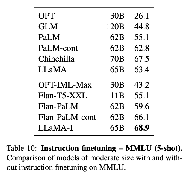 다음은 LLaMA-65B에 instruction tuning을 적용하고 MMLU에서 5-shot 평균을 낸 결과이다.