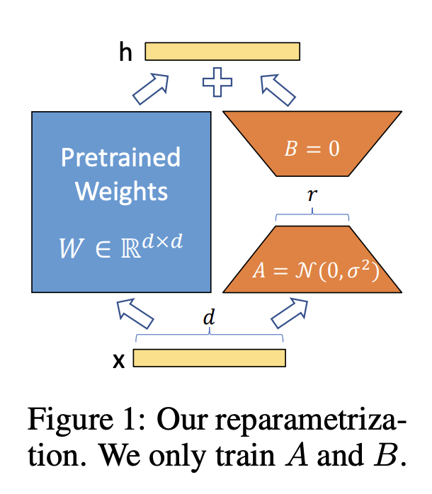 LoRA를 사용하면 위 그림과 같이 사전 학습된 가중치를 고정된 상태로 유지하면서 오른쪽의 dense layer만 학습하는데, dense layer의 weight를 low-rank로 decomposition한 matrices만을 optimizing하는 방식이다. 그래서 위 Figure 1과 같이 파인 튜닝 시에는 pre-trained weights \(W\)는 freeze하고, low-rank decomposition된 weights \(A\), \(B\)만 학습하여 W에 summation하게 된다.