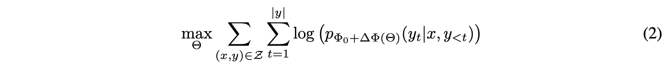 full fine-tuning의 경우 위처럼 모델은 pretrained weights \(Phi_0\) 으로 초기화되고 conditional language modeling objective를 최대화하기 위해 기울기를 반복적으로 \(\Phi_0 + \triangle\Phi\)로 업데이트한다.