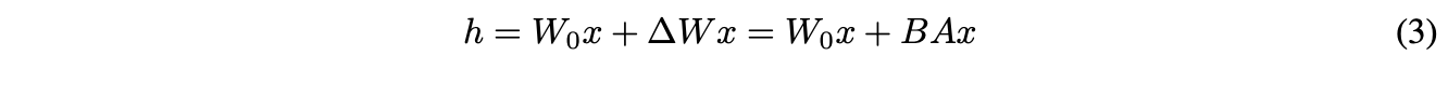 먼저 pretrained weights matrix \(W_0 ∈ R^{d\times k}\)에 대해 \(W_0 + ∆W = W_0 + BA\)로 업데이트한다. 즉, \(W_0\)는 동결하고 low-rank로 decomposition된 \(B ∈ R^{d\times r}\)와 \(A ∈ R^{r\times k}\)만을 학습한다. 그리고 \(W_0\)와 \(∆W = BA\) 모두 동일한 input에 곱해지며, 각각의 출력 벡터는 coordinate-wise로 합산된다.